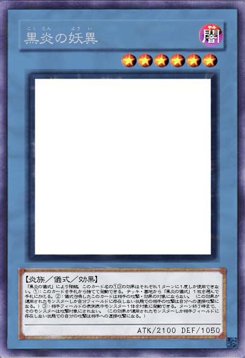 | 「黒炎の儀式」により降臨。このカード名の①③の効果はそれぞれ1ターンに1度しか使用できない。①:このカードを手札から捨てて発動できる。デッキ・墓地から「黒炎の儀式」1枚を選んで手札に加える。②:儀式召喚したこのカードは相手の攻撃・効果の対象にならない。(この効果が適用されたモンスターしか自分フィールドに存在しない状態での相手の攻撃は自分への直接攻撃になる。)③:相手フィールドの表側表示モンスター1体を対象に発動できる。ターン終了時まで、そのモンスターは攻撃対象にされない。(この効果が適用されたモンスターしか相手フィールドに存在しない状態での自分の攻撃は相手への直接攻撃になる。) | |||