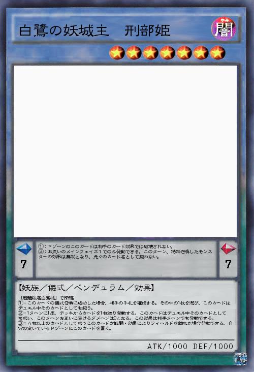 | 「魍魎跋扈白鷺城」で降臨。 ①:このカードの儀式召喚に成功した場合、相手の手札を確認する。その中の1枚を選び、このカードはデュエル中そのカードとしても扱う。 ②:1ターンに1度、デッキからカードを1枚送り発動する。このカードはデュエル中そのカードとしても扱い、このターンお互いに受けるダメージは0となる。この効果は相手ターンでも発動できる。 ③:4枚以上のカードとして扱うこのカードが戦闘・効果によりフィールドを離れた場合発動できる。自分の空いているPゾーンにこのカードを置く。 | |||