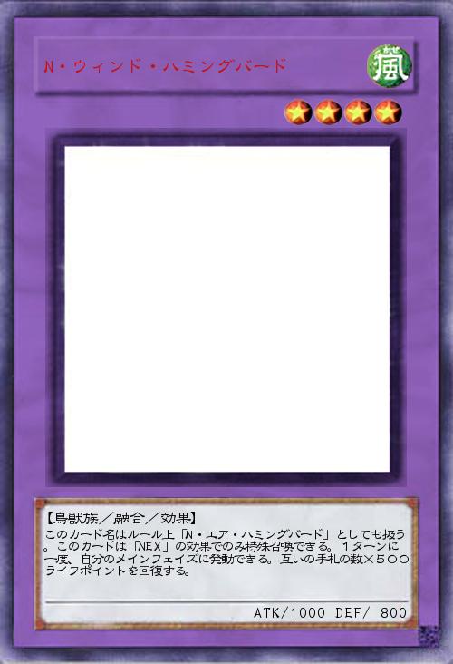 | このカード名はルール上「N・エア・ハミングバード」としても扱う。このカードは「NEX」の効果でのみ特殊召喚できる。1ターンに一度、自分のメインフェイズに発動できる。互いの手札の数×500ライフポイントを回復する。 | |||