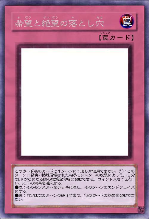 | このカード名のカードは1ターンに1度しか使用できない。①:このターンに召喚・特殊召喚された相手モンスターの攻撃によって、自分のLPが0になる際の攻撃宣言時に発動できる。コイントスを1回行い、以下の効果を適応する。 ●表:そのモンスターをデッキに戻し、そのターンのエンドフェイズにする。 ●裏:自分は次のターンの終了時まで、他のカードの効果を発動できない。 | |||
