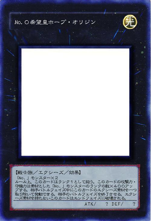 | 「No.」モンスター×2 ルール上、このカードはランク1として扱う。このカードの攻撃力・守備力は素材とした「No.」モンスターのランクの数×400アップする。相手バトルフェイズ中にこのカードのエクシーズ素材を一つ取り除いて発動できる。相手のバトルフェイズを終了させる。エクシーズ素材を持たないこのカードはエンドフェイズに破壊される。 | |||