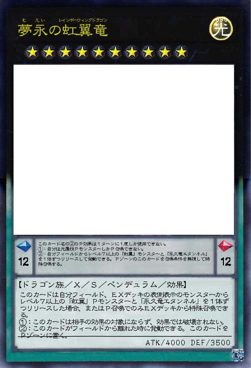 | このカードは自分フィールド、EXデッキの表側表示のモンスターからレベル7以上の「虹翼」Pモンスターと「永久竜エタンネル」を1体ずつリリースした場合、またはP召喚でのみEXデッキから特殊召喚できる。 ①:このカードは相手の効果の対象にならず、効果では破壊されない。 ②:このカードがフィールドから離れた時に発動できる。このカードをPゾーンに置く。 | |||