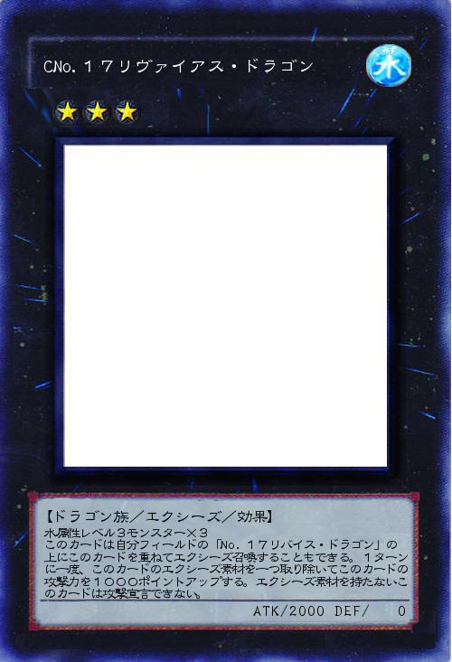 | 水属性レベル3モンスター×3 このカードは自分フィールドの「No.17リバイス・ドラゴン」の上にこのカードを重ねてエクシーズ召喚することもできる。1ターンに一度、このカードのエクシーズ素材を一つ取り除いてこのカードの攻撃力を1000ポイントアップする。エクシーズ素材を持たないこのカードは攻撃宣言できない。 | |||