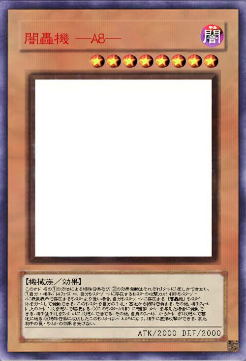 | このカ-ド名の①の方法による特殊召喚及び,②の効果発動はそれぞれ1タ-ンに1度しかできない.①自分・相手バトルフェイズ中,自分モンスタ-ゾ-ンに存在するモンスタ-の攻撃力が,相手モンスタ-ゾ-ンに表側表示で存在するモンスタ-より低い場合,自分モンスタ-ゾ-ンに存在する「闇轟機」モンスタ-1体をリリ-スして発動できる.このモンスタ-を自分の手札・墓地から特殊召喚する.その後,相手フィ-ルド上のカ-ド1枚を選んで破壊する.②このモンスタ-が相手に戦闘ダメ-ジを与えた場合に発動できる.相手は手札をランダムに1枚選んで捨てる.その後,自身のフィ-ルドからカ-ドを1枚選んで墓地に送る.③特殊召喚に成功したこのモンスタ-はレベルが4になり,相手に直接攻撃ができる.また,相手の罠・モンスタ-の効果を受けない. | |||