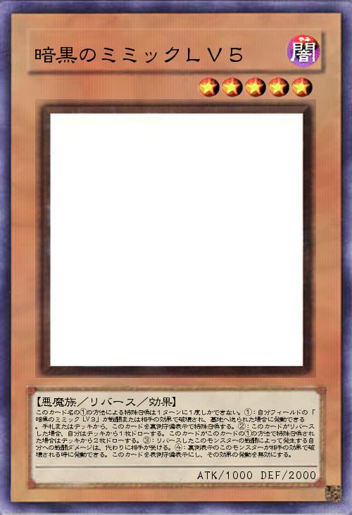 | このカード名の①の方法による特殊召喚は1ターンに1度しかできない。①:自分フィールドの「暗黒のミミック LV3」が戦闘または相手の効果で破壊され、墓地へ送られた場合に発動できる。手札またはデッキから、このカードを裏側守備表示で特殊召喚する。②:このカードがリバースした場合、自分はデッキから1枚ドローする。このカードがこのカードの①の方法で特殊召喚された場合はデッキから2枚ドローする。③:リバースしたこのモンスターの戦闘によって発生する自分への戦闘ダメージは、代わりに相手が受ける。④:裏側表示のこのモンスターが相手の効果で破壊される時に発動できる。このカードを表側守備表示にし、その効果の発動を無効にする。 | |||