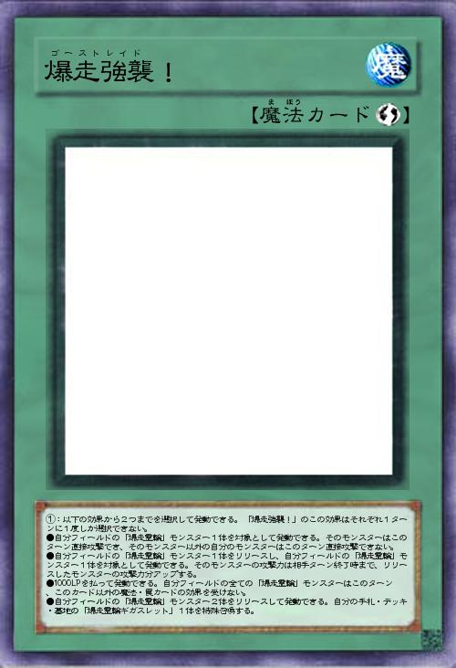 | ①:以下の効果から2つまでを選択して発動できる。「爆走強襲!」のこの効果はそれぞれ1ターンに1度しか選択できない。 ●自分フィールドの「爆走霊輪」モンスター1体を対象として発動できる。そのモンスターはこのターン直接攻撃でき、そのモンスター以外の自分のモンスターはこのターン直接攻撃できない。 ●自分フィールドの「爆走霊輪」モンスター1体をリリースし、自分フィールドの「爆走霊輪」モンスター1体を対象として発動できる。そのモンスターの攻撃力は相手ターン終了時まで、リリースしたモンスターの攻撃力分アップする。 ●1000LPを払って発動できる。自分フィールドの全ての「爆走霊輪」モンスターはこのターン、このカード以外の魔法・罠カードの効果を受けない。 ●自分フィールドの「爆走霊輪」モンスター2体をリリースして発動できる。自分の手札・デッキ・墓地の「爆走霊輪ギガスレット」1体を特殊召喚する。 | |||