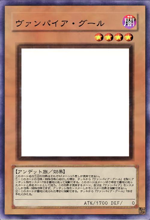 | このカード名の①②の効果はそれぞれ1ターンに1度しか使用できない。 ①:このカードの召喚・特殊召喚に成功した場合、デッキから「ヴァンパイア・グール」を除くアンデット族モンスター1体を墓地に送って発動できる。このカードはターン終了時まで墓地に送ったカードと同名カードとして扱う。この効果を使用するターン、自分は「ヴァンパイア」モンスターしか召喚・特殊召喚できず、アンデット族モンスターしかモンスター効果を発動できない。 ②:このカードが墓地に送られた場合に発動できる。デッキから「ヴァンパイア・グール」1体を手札に加える。 | |||