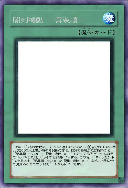 | このカ-ド名の発動は,1タ-ンに1度しかできない.①自分のLPが相手より2000以上低い時のみ発動できる.自分の墓地または除外から,「闇轟機」モンスタ-・「闇刻機動」カ-ドを計5枚選び,デッキに加えてシャッフルした後,デッキから2枚ドロ-する.この時,ドロ-したカ-ドが2枚とも「闇轟機」モンスタ-か「闇刻機動」カ-ドなら,相手に全て見せることでもう1枚デッキからドロ-できる. | |||