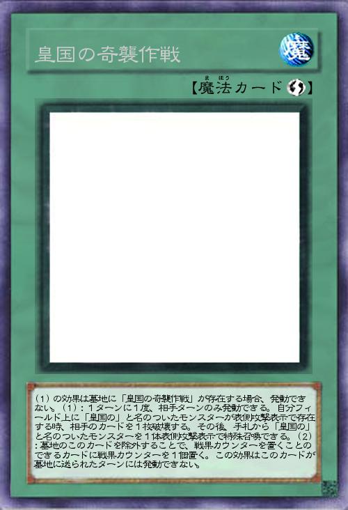 | (1)の効果は墓地に「皇国の奇襲作戦」が存在する場合、発動できない。(1):1ターンに1度、相手ターンのみ発動できる。自分フィールド上に「皇国の」と名のついたモンスターが表側攻撃表示で存在する時、相手のカードを1枚破壊する。その後、手札から「皇国の」と名のついたモンスターを1体表側攻撃表示で特殊召喚できる。(2):墓地のこのカードを除外することで、戦果カウンターを置くことのできるカードに戦果カウンターを1個置く。この効果はこのカードが墓地に送られたターンには発動できない。 | |||