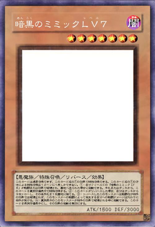 | このカードは通常召喚できず、このカード名の①の効果で特殊召喚できる。このカード名の①の方法による特殊召喚は1ターンに1度しかできない。①:自分フィールドの「暗黒のミミック LV5」が戦闘または効果で破壊され、墓地へ送られた場合に発動できる。手札またはデッキから、このカードを裏側守備表示で特殊召喚する。②:このカードがリバースした場合、自分はデッキから3枚ドローし、その後手札を1枚墓地に捨てる。③:リバースしたこのモンスターは戦闘及び相手の効果では破壊されず、このモンスターの戦闘によって発生する自分への戦闘ダメージは代わりに相手が受ける。④:裏側表示のこのモンスターが相手の効果で破壊される時に発動できる。このカードを表側守備表示にし、その効果の発動を無効にする。 | |||