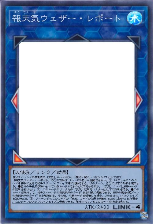 | 自分フィールドの表側表示「天気」カード2枚以上(魔法・罠カードはリンク1として扱う) 「報天気ウェザー・レポート」の①の効果は1ターンに1度しか発動できない。①:EXデッキのこのカードを相手に見せて相手スタンバイフェイズ時に発動できる。次のターン、自分に以下の効果を適用する。●自分の手札及び除外されているカードが合計5枚以下である限り、「天気」カードは相手カードの効果を受けない。②:このカードのリンク先の「天気」効果モンスターは以下の効果を得る。●このカードを除外して、相手フィールドの表側表示のカード1枚を対象に発動できる。相手の魔法&罠ゾーンの表側表示のカード1枚を破壊する。その後、対象カードを破壊した場合、次の自分のバトルフェイズを2回行える。③:フィールドのこのカードが「天気」カードの効果を発動するために除外された場合、次のターンのスタンバイフェイズに発動できる。除外されているこのカ | |||