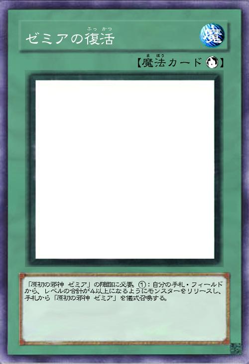 | 「原初の邪神 ゼミア」の降臨に必要。①:自分の手札・フィールドから、レベルの合計が4以上になるようにモンスターをリリースし、手札から「原初の邪神 ゼミア」を儀式召喚する。 | |||