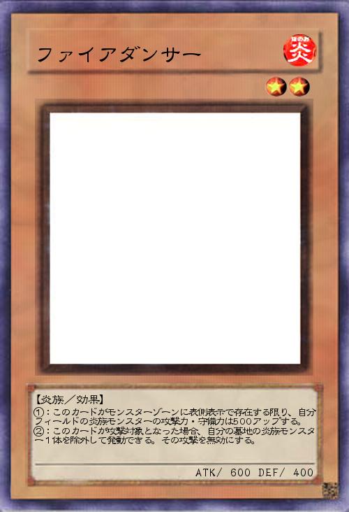 | ①:このカードがモンスターゾーンに表側表示で存在する限り、自分フィールドの炎族モンスターの攻撃力・守備力は500アップする。 ②:このカードが攻撃対象となった場合、自分の墓地の炎族モンスター1体を除外して発動できる。その攻撃を無効にする。 | |||