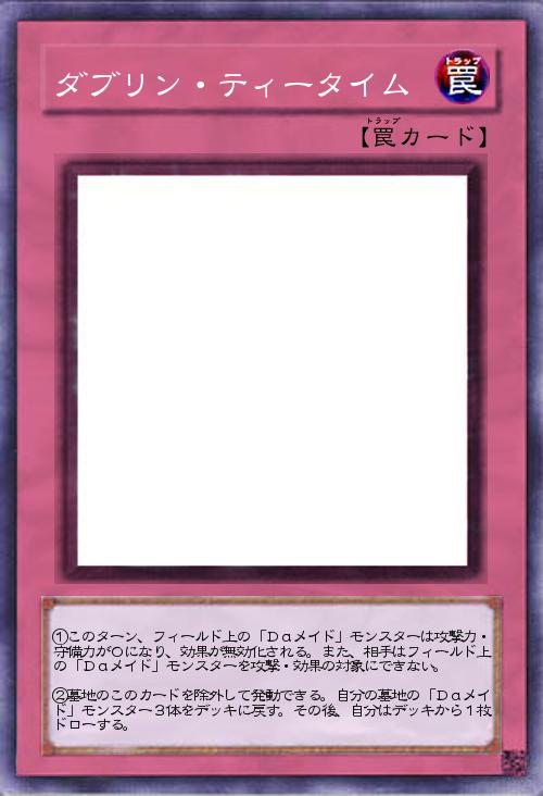 | ①このターン、フィールド上の「Daメイド」モンスターは攻撃力・守備力が0になり、効果が無効化される。また、相手はフィールド上の「Daメイド」モンスターを攻撃・効果の対象にできない。 ②墓地のこのカードを除外して発動できる。自分の墓地の「Daメイド」モンスター3体をデッキに戻す。その後、自分はデッキから1枚ドローする。 | |||