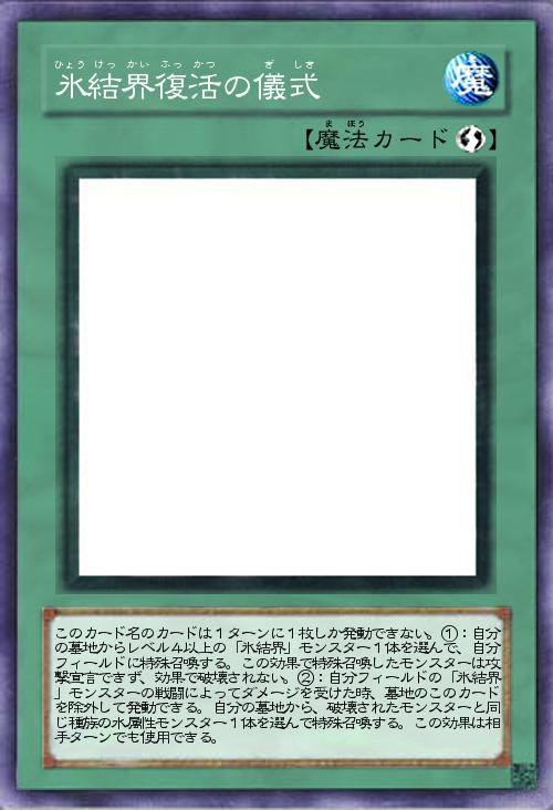 | このカード名のカードは1ターンに1枚しか発動できない。①:自分の墓地からレベル4以上の「氷結界」モンスター1体を選んで、自分フィールドに特殊召喚する。この効果で特殊召喚したモンスターは攻撃宣言できず、効果で破壊されない。②:自分フィールドの「氷結界」モンスターの戦闘によってダメージを受けた時、墓地のこのカードを除外して発動できる。自分の墓地から、破壊されたモンスターと同じ種族の水属性モンスター1体を選んで特殊召喚する。この効果は相手ターンでも使用できる。 | |||