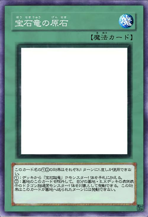 | このカード名の①②の効果はそれぞれ1ターンに1度しか使用できない。 ①:デッキから「宝石超竜」Pモンスター1体を手札に加える。 ②:墓地のこのカードを除外して、自分の墓地・EXデッキの表側表示のドラゴン族通常モンスター1体を対象として発動できる。この効果はこのカードが墓地へ送られたターンには発動できない。 | |||