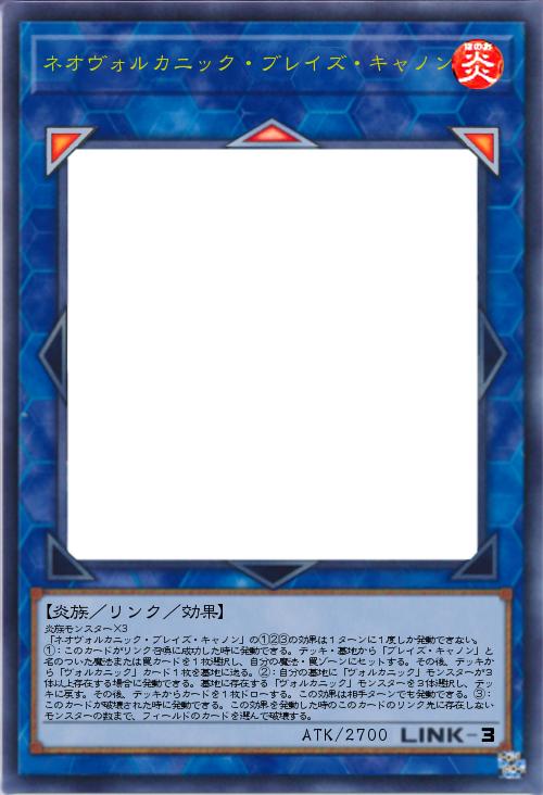 | 炎族モンスター×3 「ネオヴォルカニック・ブレイズ・キャノン」の①②③の効果は1ターンに1度しか発動できない。 ①:このカードがリンク召喚に成功した時に発動できる。デッキ・墓地から「ブレイズ・キャノン」と名のついた魔法または罠カードを1枚選択し、自分の魔法・罠ゾーンにセットする。その後、デッキから「ヴォルカニック」カード1枚を墓地に送る。②:自分の墓地に「ヴォルカニック」モンスターが3体以上存在する場合に発動できる。墓地に存在する「ヴォルカニック」モンスターを3体選択し、デッキに戻す。その後、デッキからカードを1枚ドローする。この効果は相手ターンでも発動できる。③:このカードが破壊された時に発動できる。この効果を発動した時のこのカードのリンク先に存在しないモンスターの数まで、フィールドのカードを選んで破壊する。 | |||