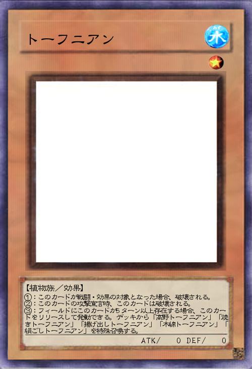 | ①:このカードが戦闘・効果の対象となった場合、破壊される。 ②:このカードの攻撃宣言時、このカードは破壊される。 ③:フィールドにこのカードが5ターン以上存在する場合、このカードをリリースして発動できる。デッキから「高野トーフニアン」「焼きトーフニアン」「揚げ出しトーフニアン」「木綿トーフニアン」「絹ごしトーフニアン」を特殊召喚する。 | |||
