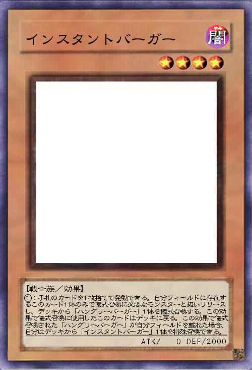 | ①:手札のカードを1枚捨てて発動できる。自分フィールドに存在するこのカード1体のみで儀式召喚に必要なモンスターと扱いリリースし、デッキから「ハングリーバーガー」1体を儀式召喚する。この効果で儀式召喚に使用したこのカードはデッキに戻る。この効果で儀式召喚された「ハングリーバーガー」が自分フィールドを離れた場合、自分はデッキから「インスタントバーガー」1体を特殊召喚できる。 | |||
