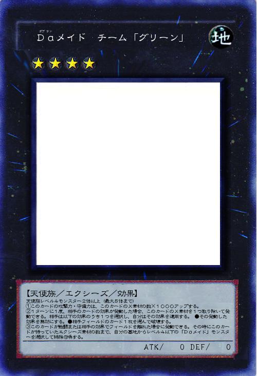 | 天使族レベル4モンスター2体以上(最大5体まで) ①このカードの攻撃力・守備力は、このカードのX素材の数×1000アップする。 ②1ターンに1度、相手のカードの効果が発動した場合、このカードのX素材を1つ取り除いて発動できる。相手は以下の効果のうち1つを選択し、自分はその効果を適用する。 ●その発動した効果を無効にする。●相手フィールドのカード1枚を選んで破壊する。 ③このカードが戦闘または相手の効果でフィールドを離れた場合に発動できる。その時にこのカードが持っていたエクシーズ素材の数まで、自分の墓地からレベル4以下の「Daメイド」モンスターを選択して特殊召喚する。 | |||