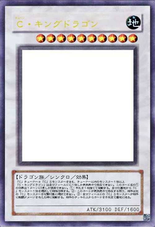 | 「C」チューナー+「C」Sモンスターを含む、チューナー以外のモンスター1体以上 「C・キングドラゴン」は自分フィールドに1体しか表側表示で存在できない。このカード名の①の効果は1ターンに1度しか使用できない。①:手札を1枚捨てて発動する。自分の墓地から「C」モンスター1体を選択して特殊召喚する。②:このカードが表側表示で存在する限り、相手は他の「C」モンスターを攻撃対象に選択できない。③:自分フィールドの「C」Sモンスターが相手に戦闘ダメージを与えた時に発動する。相手のデッキの上からカードを5枚まで墓地に送る。 | |||