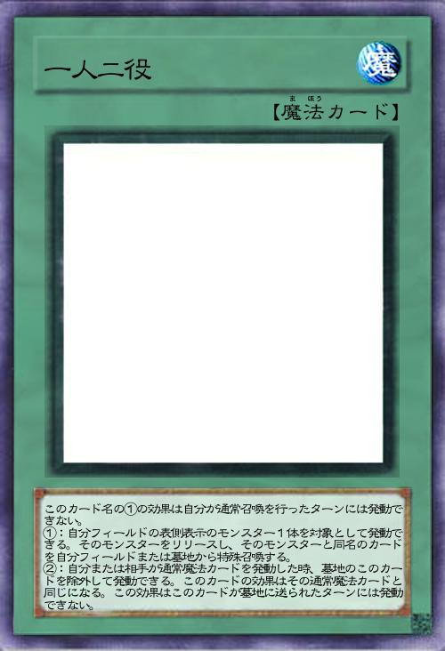 | このカード名の①の効果は自分が通常召喚を行ったターンには発動できない。 ①:自分フィールドの表側表示のモンスター1体を対象として発動できる。そのモンスターをリリースし、そのモンスターと同名のカードを自分フィールドまたは墓地から特殊召喚する。 ②:自分または相手が通常魔法カードを発動した時、墓地のこのカードを除外して発動できる。このカードの効果はその通常魔法カードと同じになる。この効果はこのカードが墓地に送られたターンには発動できない。 | |||