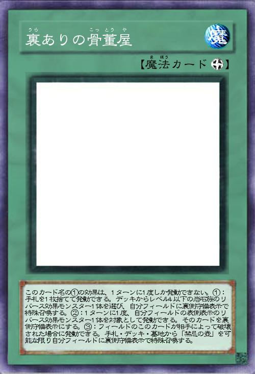 | このカード名の①の効果は、1ターンに1度しか発動できない。①:手札を1枚捨てて発動できる。デッキからレベル4以下の岩石族のリバース効果モンスター1体を選び、自分フィールドに裏側守備表示で特殊召喚する。②:1ターンに1度、自分フィールドの表側表示のリバース効果モンスター1体を対象として発動できる。そのカードを裏側守備表示にする。③:フィールドのこのカードが相手によって破壊された場合に発動できる。手札・デッキ・墓地から「禁忌の壺」を可能な限り自分フィールドに裏側守備表示で特殊召喚する。 | |||