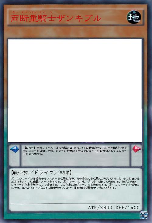 | 【D条件】自分フィールド上の攻撃力2000以下の戦士族モンスターが戦闘で相手モンスターを破壊した時、ダメージ計算終了時にそのカードをD素材としてこのカードをD召喚する。 | |||