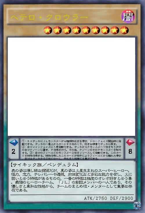 P召喚効果はPモンスター及びP召喚の欠点である「Pテーマデッキ以外上手く運用し辛い」という欠点をフューチャーした効果で、他のJLメンバー同様にこのカードは「P召喚及びPモンスター」を担当しているので、非PテーマデッキでもP召喚が簡単に行えるように作っております。