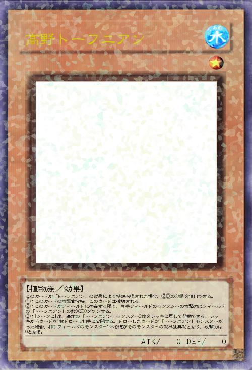 | このカードが「トーフニアン」の効果により特殊召喚された場合、②③の効果を使用できる。 ①:このカードの攻撃宣言時、このカードは破壊される。 ②:このカードがフィールドに存在する限り、相手フィールドのモンスターの攻撃力はフィールドの「トーフニアン」の数×200ダウンする。 ③:1ターンに1度、墓地の「トーフニアン」モンスター2体をデッキに戻して発動できる。デッキからカードを1枚ドローし相手に公開する。ドローしたカードが「トーフニアン」モンスターだった場合、相手フィールドのモンスター1体を選びそのモンスターの効果は無効となり、攻撃力は0となる。 | |||