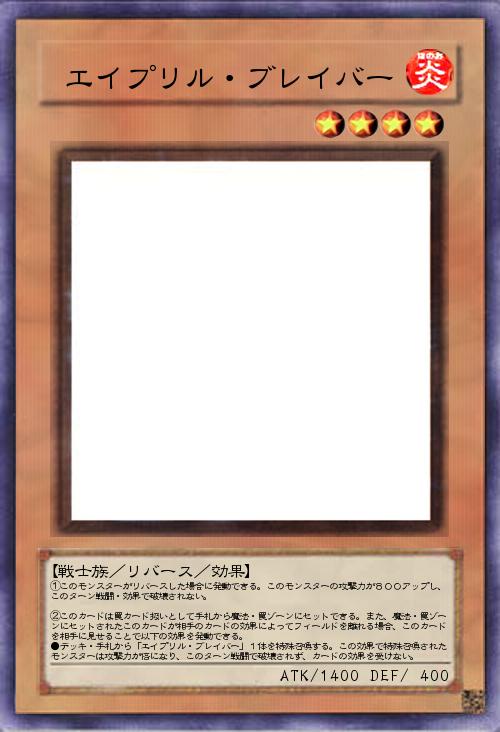| ①このモンスターがリバースした場合に発動できる。このモンスターの攻撃力が800アップし、このターン戦闘・効果で破壊されない。 ②このカードは罠カード扱いとして手札から魔法・罠ゾーンにセットできる。また、魔法・罠ゾーンにセットされたこのカードが相手のカードの効果によってフィールドを離れる場合、このカードを相手に見せることで以下の効果を発動できる。 ●デッキ・手札から「エイプリル・ブレイバー」1体を特殊召喚する。この効果で特殊召喚されたモンスターは攻撃力が倍になり、このターン戦闘で破壊されず、カードの効果を受けない。 | |||