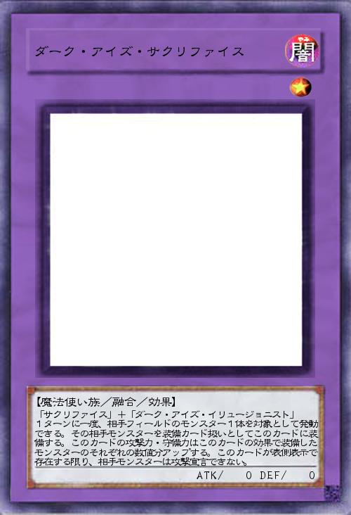 | 「サクリファイス」+「ダーク・アイズ・イリュージョニスト」 1ターンに一度、相手フィールドのモンスター1体を対象として発動できる。その相手モンスターを装備カード扱いとしてこのカードに装備する。このカードの攻撃力・守備力はこのカードの効果で装備したモンスターのそれぞれの数値分アップする。このカードが表側表示で存在する限り、相手モンスターは攻撃宣言できない。 | |||