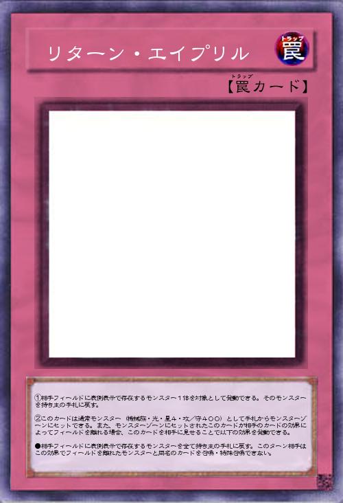 | ①相手フィールドに表側表示で存在するモンスター1体を対象として発動できる。そのモンスターを持ち主の手札に戻す。 ②このカードは通常モンスター(機械族・光・星4・攻/守400)として手札からモンスターゾーンにセットできる。また、モンスターゾーンにセットされたこのカードが相手のカードの効果によってフィールドを離れる場合、このカードを相手に見せることで以下の効果を発動できる。 ●相手フィールドに表側表示で存在するモンスターを全て持ち主の手札に戻す。このターン相手はこの効果でフィールドを離れたモンスターと同名のカードを召喚・特殊召喚できない。 | |||