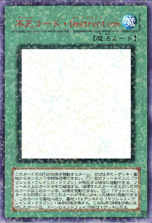 | このカード名の①の効果を発動するターン、自分は手札・デッキ・墓地からモンスターを特殊召喚できない。①:自分フィールド上に「マリシャス・ヴレインズ・ドラゴン」が存在する場合に発動できる。フィールド上のカードを全て破壊する。破壊されたカード名と同じ名前のカードはこのターン中、効果を発動できない。②:「マリシャス」カードの効果によってこのカードが手札に加わった場合に発動できる。このカードを墓地へ送り、墓地・EXデッキから「マリシャス・ヴレインズ・ドラゴン」1体を特殊召喚する。この効果で特殊召喚に成功したカードは、ターンのエンドフェイズ時にEXデッキに戻る。 | |||