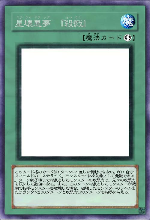 | このカード名のカードは1ターンに1度しか発動できない。①:自分フィールドの「ステライド」モンスター1体を対象として発動できる。ターン終了時まで対象としたモンスターの攻撃力は、元々の攻撃力を灰にした数値になる。また、このターン対象としたモンスターが戦闘で相手モンスターを破壊した場合、破壊したモンスターのレベルまたはランク×200ダメージと攻撃力分のダメージを相手に与える。 | |||
