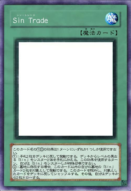 | このカード名の①②の効果は1ターンにいずれか1つしか使用できない。 ①:手札2枚をデッキに戻して発動できる。デッキからレベルの異なる「Sin」モンスター2体を手札に加える。この効果を使用するターン、自分は「Sin」モンスターしか特殊召喚できない。 ②:墓地に存在する場合、このカード以外の自分の墓地の「Sin」カード2枚を対象として発動できる。このカードを除外し、対象としたカードをデッキに戻してシャッフルする。その後、自分はデッキから2枚ドローする。 | |||