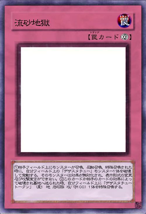 | ①相手フィールド上にモンスターが召喚、反転召喚、特殊召喚された時に、自分フィールド上の「デザスタチュー」モンスター1体を破壊して発動する。そのモンスターは効果が無効化され、表示形式の変更及び攻撃宣言ができない。②このカードか相手のカードの効果によって破壊され墓地へ送られた時、自分フィールド上に「デザスタチュートークン」(星1 地 岩石族 攻/守100)1体を特殊召喚する。 | |||