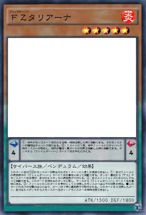 | このカード名の①②のモンスター効果はそれぞれ1ターンに1度しか使用できない。①:自分フィールドの表側表示の「フレイムサーバー」カード1枚を墓地に送って発動できる。デッキ・墓地から「FZ」Pモンスター1体を選び、自分のEXデッキに表側表示で加える。②:自分メインフェイズに800LP払って発動できる。このカードを持ち主のデッキに戻し、デッキから「フレイムサーバー」カード1枚を墓地に送る。③:フィールドのこのカードを素材としてX召喚したモンスターは以下の効果を得る。●このカードの元々の攻撃力は0になり、ターン終了時に裏側表示で除外される。このカードをX召喚したターン、自分はEXデッキからXモンスター及びリンクモンスターを特殊召喚できない。 | |||