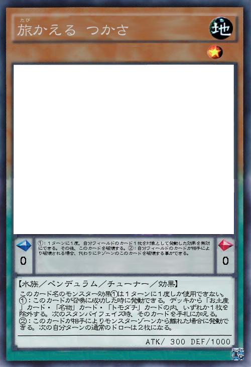 P効果はタン1で自分カード1枚を対象とする効果を無効にできるとこれまた優秀。その後は自壊するため、1回限り。また、自分カードが破壊される場合に身代わりになれるため全体除去などにも対応できるとつかさクンの力のほどはうかがえない…!チューナーでもあるため、たくさんのトモダチや名物、お土産に出会うことができることでしょう!