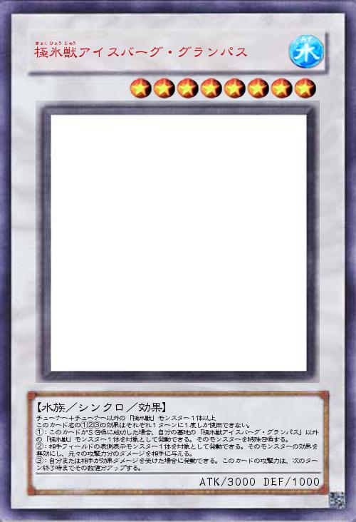 | チューナー+チューナー以外の「極氷獣」モンスター1体以上 このカード名の①②③の効果はそれぞれ1ターンに1度しか使用できない。 ①:このカードがS召喚に成功した場合、自分の墓地の「極氷獣アイスバーグ・グランパス」以外の「極氷獣」モンスター1体を対象として発動できる。そのモンスターを特殊召喚する。 ②:相手フィールドの表側表示モンスター1体を対象として発動できる。そのモンスターの効果を無効にし、元々の攻撃力分のダメージを相手に与える。 ③:自分または相手が効果ダメージを受けた場合に発動できる。このカードの攻撃力は、次のターン終了時までその数値分アップする。 | |||