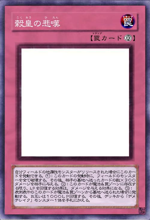 | 自分フィールドの地属性モンスターがリリースされた場合にこのカードを発動できる。①:このカードの発動時に、フィールドのモンスターを全て破壊する。その後、相手の墓地へ送ったカードの数×300ダメージを相手に与える。②:このカードが魔法&罠ゾーンに存在する限り、LPを回復する効果は、ダメージを与える効果になる。③:表側表示のこのカードが魔法&罠ゾーンから墓地へ送られた場合に発動する。お互いは1000LP回復する。その後、デッキから「デメテレイク」モンスター1体を手札に加える。 | |||