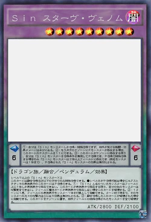 | レベル7以上の「Sin」モンスター×2 このカードは融合召喚及び以下の方法でのみ特殊召喚できる。●レベル9がP召喚可能な場合にエクストラデッキの表側表示のこのカードはP召喚できる。①:「Sin」と名のついたモンスターはフィールド上に1体しか表側表示で存在できない。このカードが表側表示で存在する限り、自分の他のモンスターは攻撃宣言できない。フィールド魔法カードが表側表示で存在しない場合このカードを破壊する。②:1ターンに1度、フィールドの表側表示モンスター1体を対象として発動できる。ターン終了時まで、そのモンスターの元々の攻撃力は0になり効果は無効化される。③:融合召喚したこのカードが破壊された場合に発動できる。このカードをPゾーンに置き、相手フィールドの特殊召喚されたモンスターを全て破壊する。 | |||