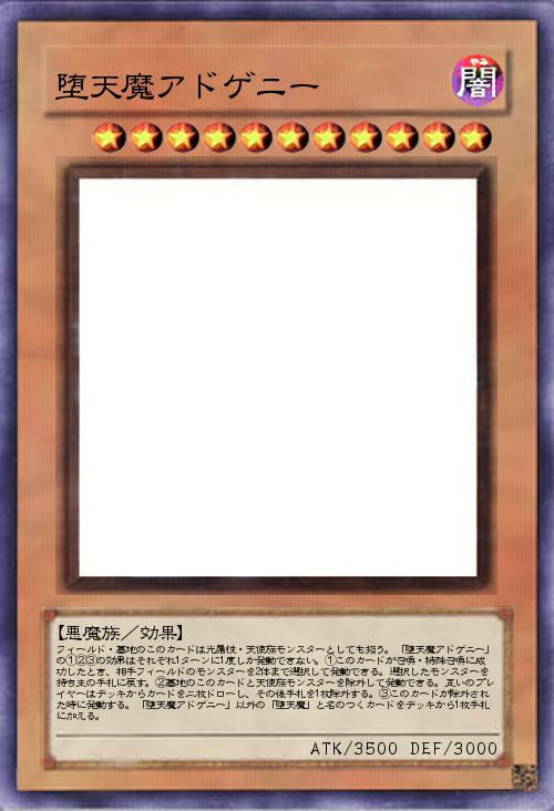 | フィールド・墓地のこのカードは光属性・天使族モンスターとしても扱う。「堕天魔アドゲニー」の①②③の効果はそれぞれ1ターンに1度しか発動できない。①このカードが召喚・特殊召喚に成功したとき、相手フィールドのモンスターを2体まで選択して発動できる。選択したモンスターを持ち主の手札に戻す。②墓地のこのカードと天使族モンスターを除外して発動できる。互いのプレイヤーはデッキからカードを二枚ドローし、その後手札を1枚除外する。③このカードが除外された時に発動する。「堕天魔アドゲニー」以外の「堕天魔」と名のつくカードをデッキから1枚手札に加える。 | |||