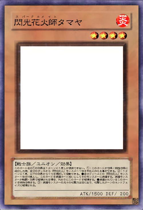 | このカード名の①の効果は1ターンに1度しか使用できない。①:このカードが召喚・特殊召喚に成功した時、自分のデッキから「閃光花火」モンスター1体を手札に加える事ができる。②:1ターンに1度、以下の効果から1つを選択して発動できる。●自分フィールドの「閃光花火」モンスター1体を対象とし、このカードを装備カード扱いとしてそのモンスターに装備する。装備モンスターが戦闘・効果で破壊される場合、代わりにこのカードを破壊する。●装備されているこのカードを特殊召喚する。③:装備モンスターの元々の攻撃力は倍になり、攻撃したターンのエンドフェイズに破壊される。 | |||