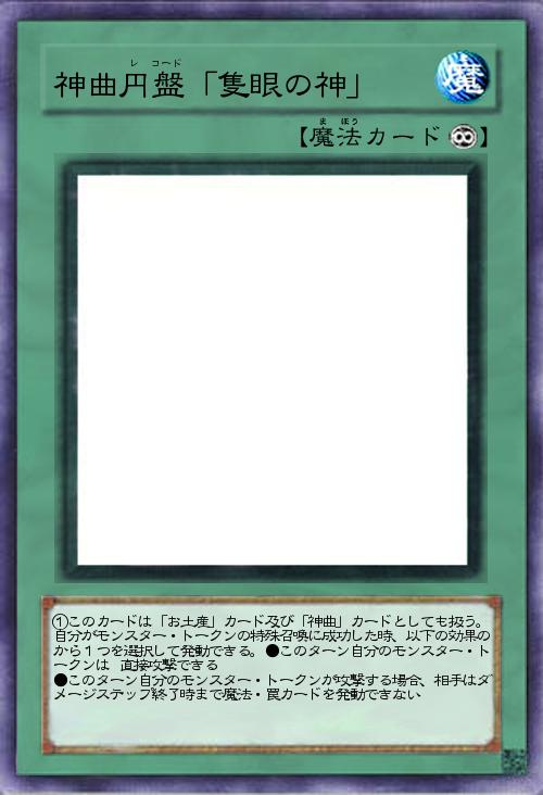 | ①このカードは「お土産」カード及び「神曲」カードとしても扱う。自分がモンスター・トークンの特殊召喚に成功した時、以下の効果のから1つを選択して発動できる。●このターン自分のモンスター・トークンは 直接攻撃できる ●このターン自分のモンスター・トークンが攻撃する場合、相手はダメージステップ終了時まで魔法・罠カードを発動できない | |||