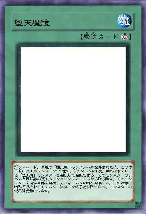 | ①フィールド、墓地の「堕天魔」モンスターが除外された時、このカードに堕天カウンターを1つ置く。②1ターンに1度、除外されている「堕天魔」モンスターを選択して発動できる。そのモンスターのレベルと同じ数の堕天カウンターをフィールドから取り除き、そのモンスターを召喚条件を無視してフィールドに特殊召喚する。この効果で特殊召喚されたモンスターはターン終了時に除外され、モンスターの効果は発動できない。 | |||