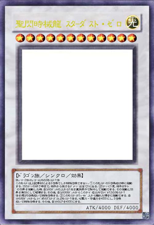 | Sチュ-ナ-2体+チュ-ナ-以外のSモンスタ-1体 このモンスタ-は上記素材によるS召喚でしか特殊召喚できない.①このモンスタ-のS召喚成功時に発動する.次のタ-ンの終了時まで,相手から受けるダメ-ジは全て0になる.②1タ-ンに1度,相手がカ-ドの効果を発動した時,自分のデッキの上から1枚を裏側表示で除外して発動できる.その発動と効果を無効にして破壊する.その後,自分のEXデッキからこのカ-ド名以外でレベル12のSモンスタ-1体を選びS召喚扱いで特殊召喚する.③このモンスタ-がフィ-ルド上から離れた場合に発動できる.自分のEXデッキから,レベル8の「スタ-ダスト」Sモンスタ-1体を,攻撃力・守備力を4000にし,S召喚扱いで特殊召喚する.その後,自分のLPを4000にする. | |||