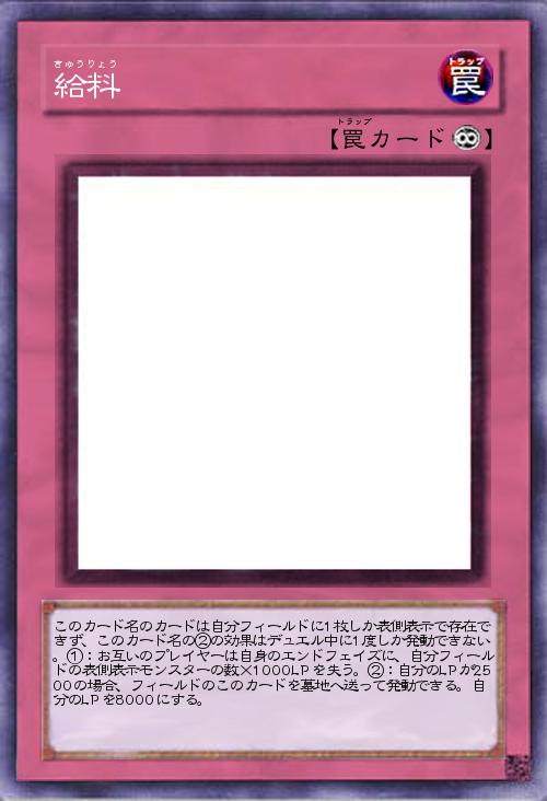 | このカード名のカードは自分フィールドに1枚しか表側表示で存在できず、このカード名の②の効果はデュエル中に1度しか発動できない。①:お互いのプレイヤーは自身のエンドフェイズに、自分フィールドの表側表示モンスターの数×1000LPを失う。②:自分のLPが2500の場合、フィールドのこのカードを墓地へ送って発動できる。自分のLPを8000にする。 | |||