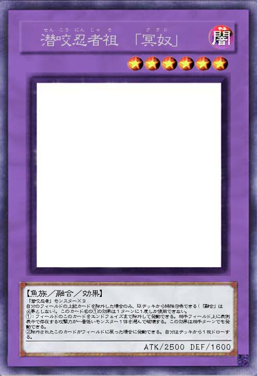 | 「潜咬忍者」モンスター×3 自分のフィールドの上記カードを除外した場合のみ、EXデッキから特殊召喚できる(「融合」は必要としない)。このカード名の①の効果は1ターンに1度しか使用できない。 ①:フィールドのこのカードをエンドフェイズまで除外して発動できる。相手フィールド上に表側表示で存在する攻撃力が一番低いモンスター1体を選んで破壊する。この効果は相手ターンでも発動できる。 ②除外されたこのカードがフィールドに戻った場合に発動できる。自分はデッキから1枚ドローする。 | |||