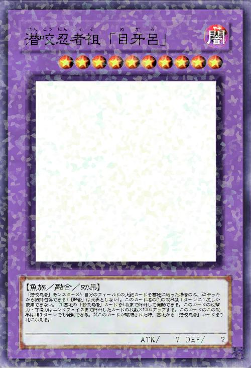 | 「潜咬忍者」モンスター×4 自分のフィールドの上記カードを墓地に送った場合のみ、EXデッキから特殊召喚できる(「融合」は必要としない)。このカード名の①の効果は1ターンに1度しか使用できない。 ①墓地の「潜咬忍者」カードを4枚まで除外して発動できる。このカードの攻撃力・守備力はエンドフェイズまで除外したカードの枚数×1000アップする。このカードのこの効果は相手ターンでも発動できる。②このカードが破壊された時、墓地から「潜咬忍者」カードを手札に加える。 | |||